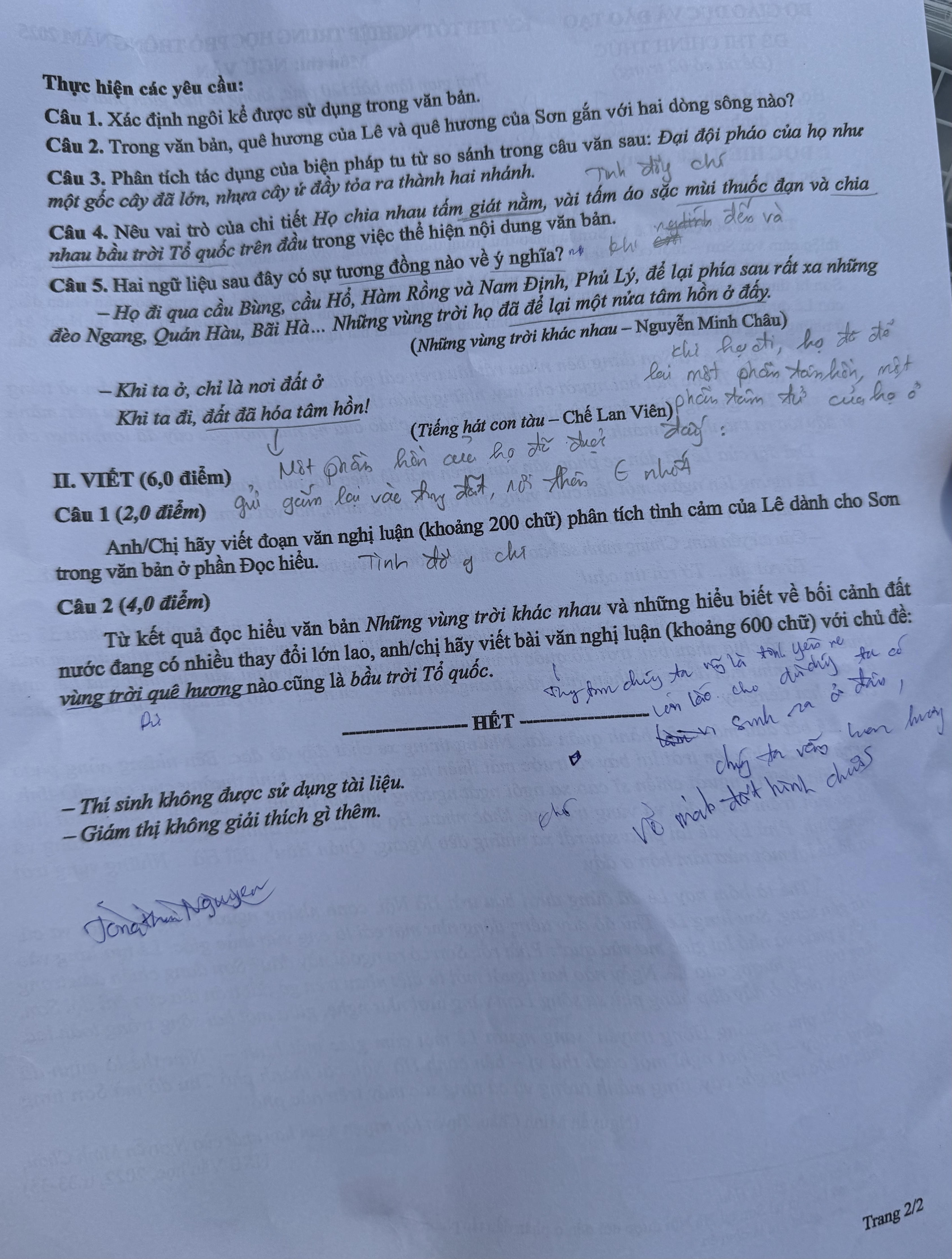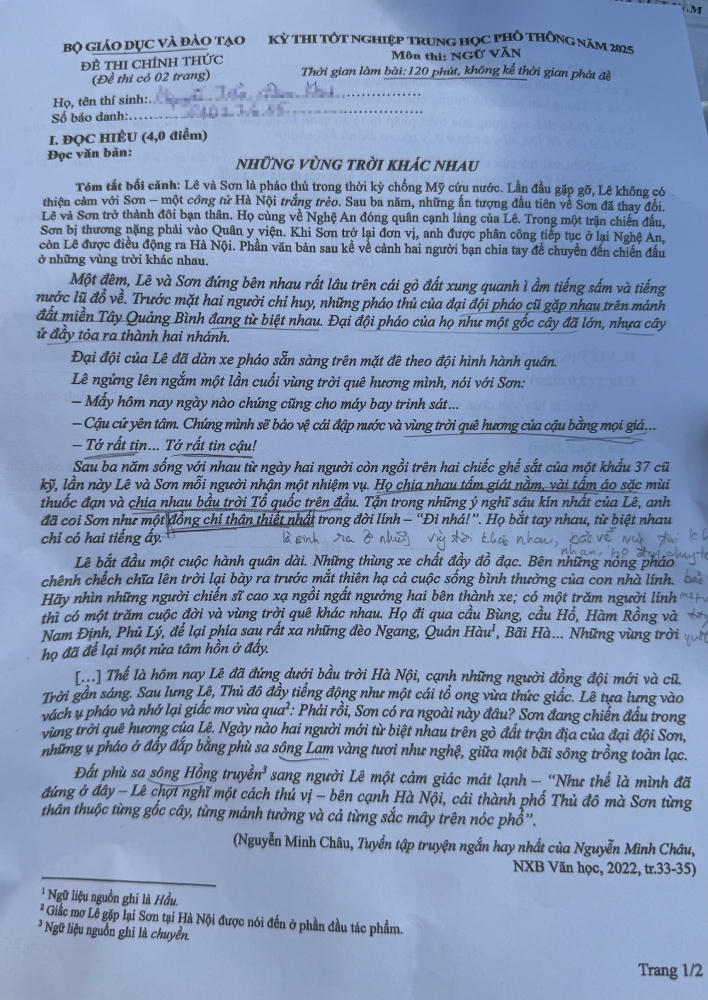 Trong phần Viết, câu nghị luận văn học yêu cầu thí sinh phân tích tình cảm của nhân vật Lê dành cho Sơn. Phần nghị luận xã hội nói về những thay đổi lớn lao của đất nước, yêu cầu thí sinh viết bài với chủ đề "vùng trời quê hương nào cũng là bầu trời Tổ quốc".