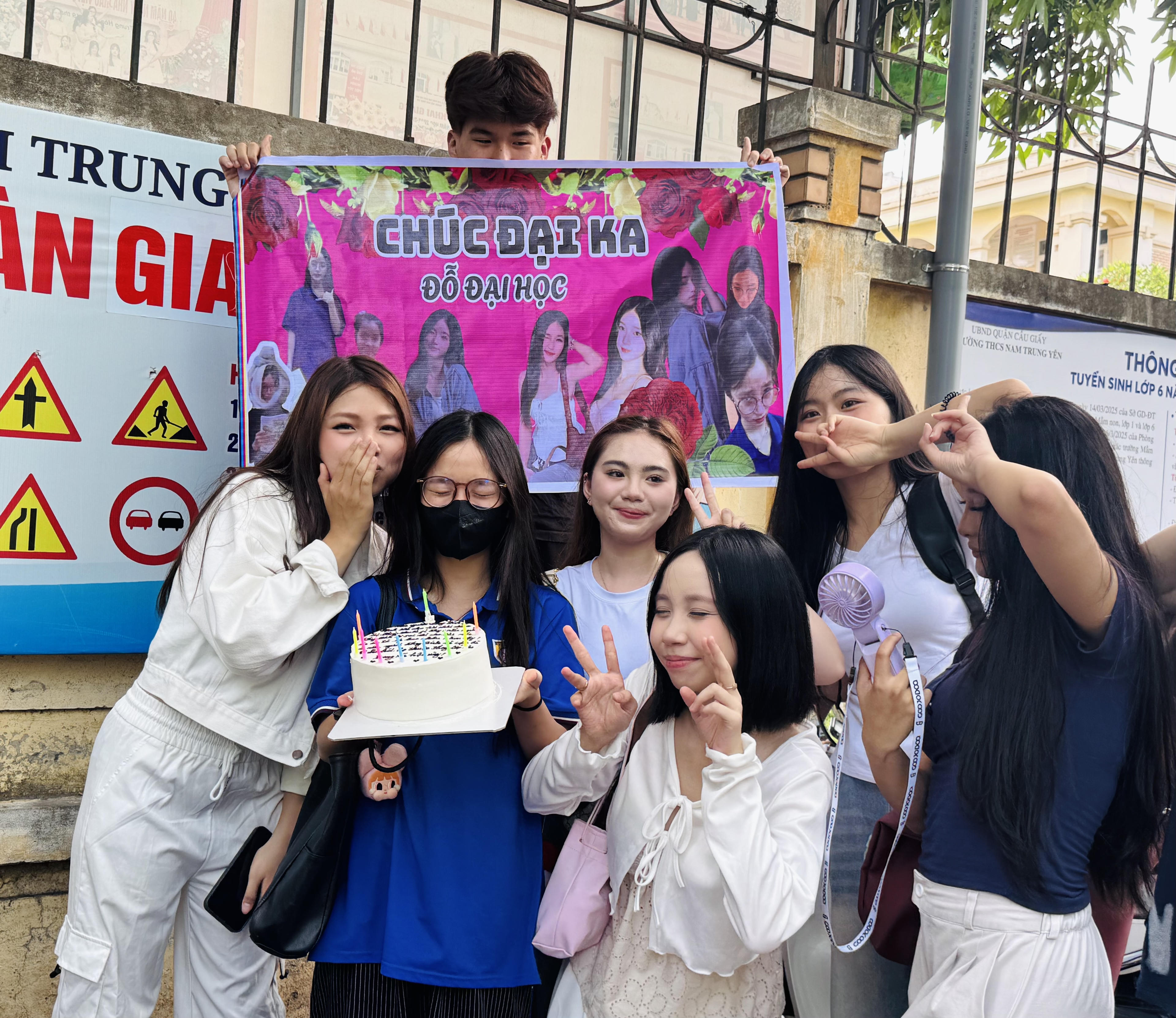 Một thí sinh được bạn mang bánh và khẩu hiệu đi cổ vũ tại điểm thi Trường THCS Nam Trung Yên (Hà Nội). |