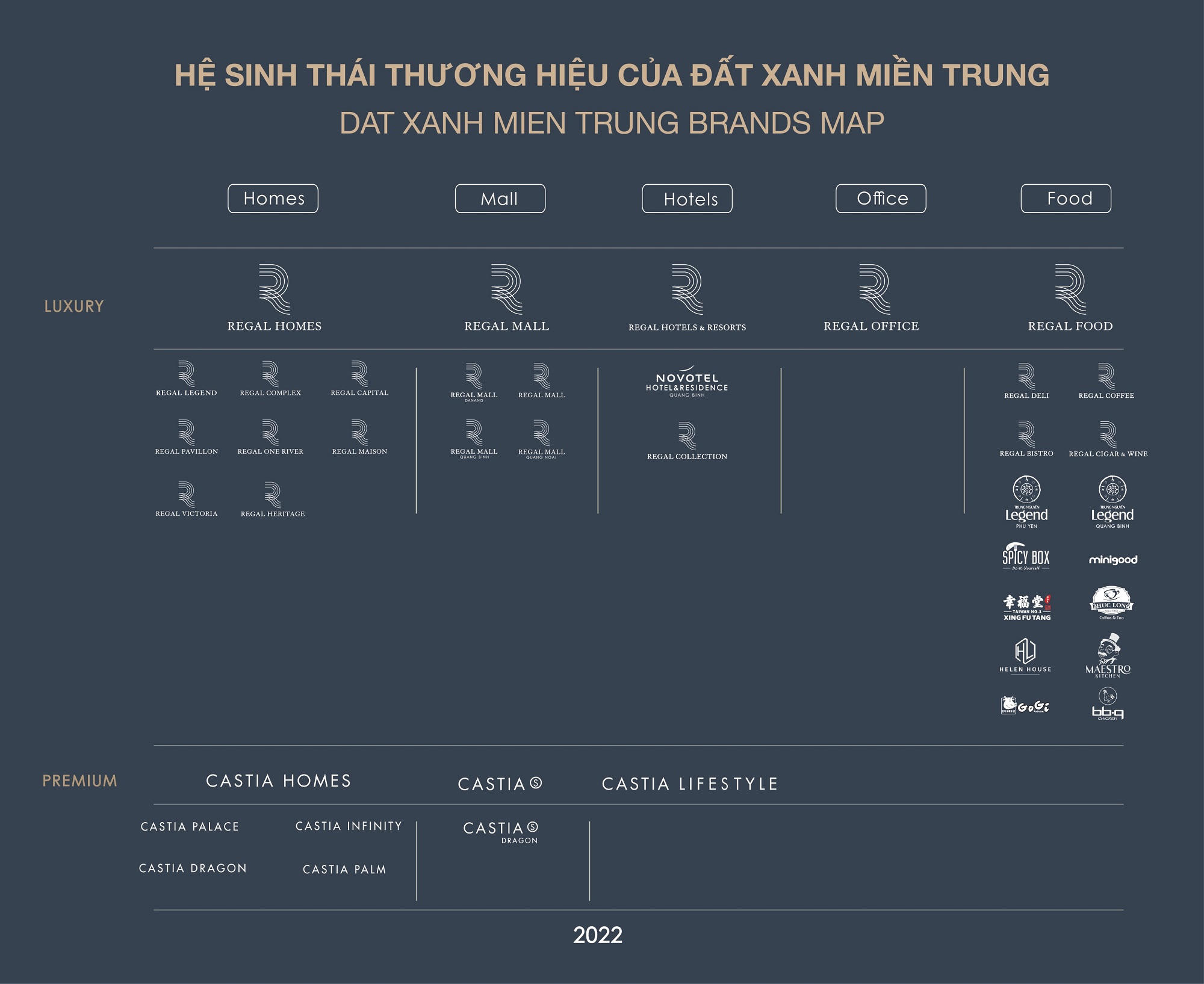 Cùng với Regal Homes, giai đoạn 2022 - 2030, Regal Food, Regal Mall, Regal Hotels and Resorts, Regal Office sẽ trở thành các thương hiệu định giá tỷ đô tiếp theo của Đất Xanh Miền Trung, mang tới bản sắc độc đáo và mô hình trải nghiệm tiện lợi, sang trọng khác biệt. Bên cạnh đó, phân khúc 4 sao bao gồm thương hiệu Castia Homes, Castia S, Castia Lifestyle tiếp tục được hoàn thiện mang đến những trải nghiệm tuyệt vời cho cộng đồng cư dân tinh hoa.