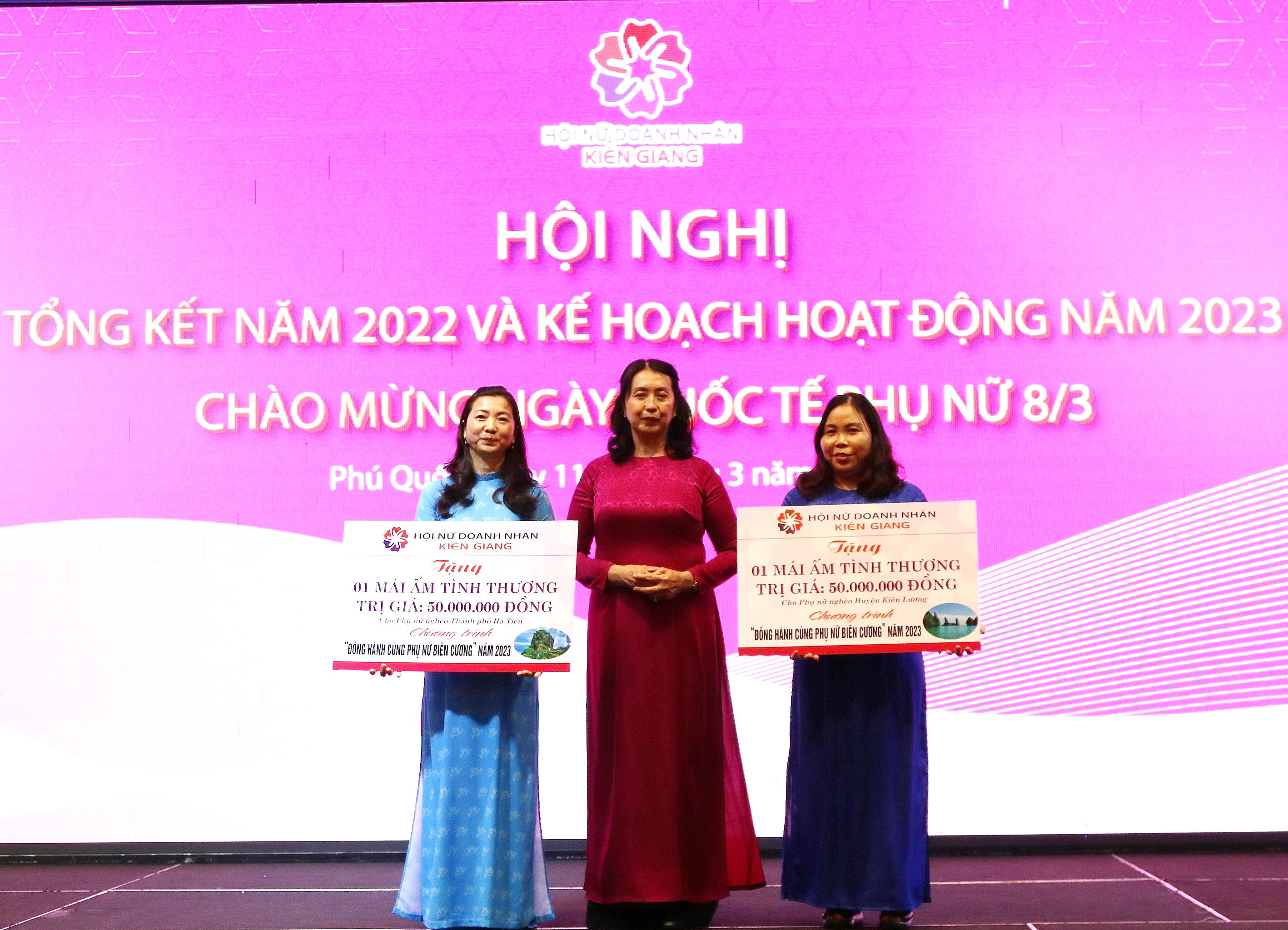 Dịp này, Hội Nữ doanh nhân tỉnh Kiên Giang đã trao bảng tượng trưng 111 triệu đồng thực hiện chương trình “Mẹ đỡ đầu” cho 37 trẻ mồ côi do ảnh hưởng dịch COVID-19 cho Hội Liên hiệp Phụ nữ tỉnh Kiên Giang; đồng thời, trao 2 mái ấm tình thương (mỗi căn 50 triệu đồng) cho Phụ nữ nghèo ở TP Hà Tiên và huyện Kiên Lương.