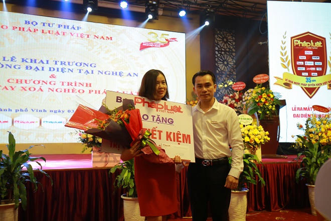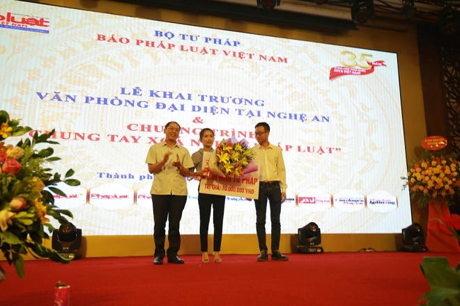 Nhân dịp này, ông Trần Đức Vinh - Phó Tổng Biên tập Báo PLVN đã trao sổ tiết kiệm cho Mẹ Việt Nam Anh hùng Nguyễn Thị Lan trị giá 10 triệu đồng; ông Trần Ngọc Hà - Trưởng ban Văn hóa Xã hội trao Mái ấm tư pháp trị giá 70 triệu đồng cho cán bộ tư pháp xã Châu Lý, huyện Qùy Hợp; ông Đỗ Quang Trưởng trao sổ tiết kiệm trị giá 10 triệu đồng cho người nhà Mẹ Việt Nam Anh hùng Trần Thị Sáu; ông Ngô Văn Toàn trao sổ tiết kiệm 10 triệu đồng cho cán bộ tư pháp xã Nam Sơn, huyện Quỳ Hợp.