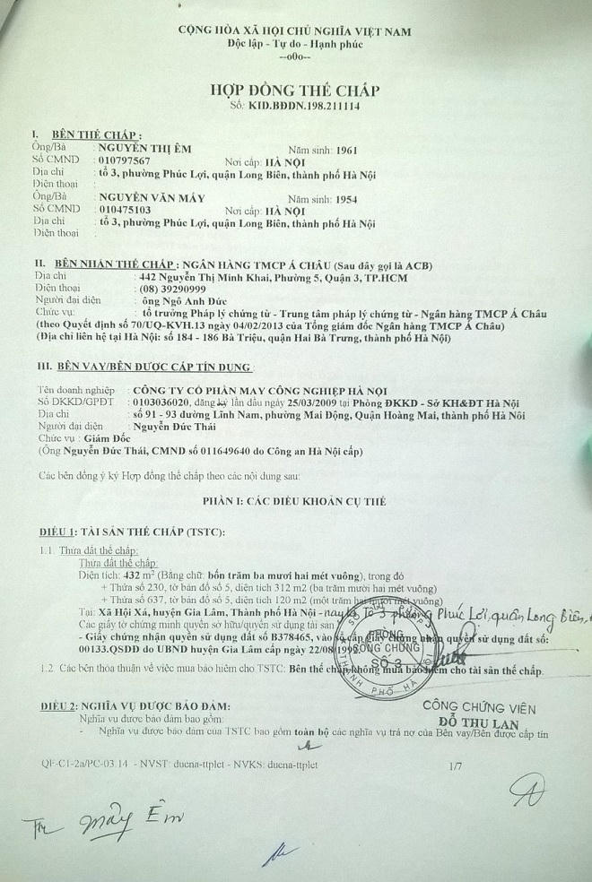 Theo đó, khi kí hợp đồng tại nhà ông Mấy, tờ giấy cuối hợp đồng ghi nội dung tài sản thế chấp ngân hàng mua bán Công ty May Bắc Giang. Nhưng hợp đồng lưu tại phòng công chứng lại có nội dung Thái đem sổ đỏ thế chấp vay vốn tại ngân hàng Á Châu ACB, phòng giao dịch Kim Đồng số tiền 2,8 tỉ đồng.