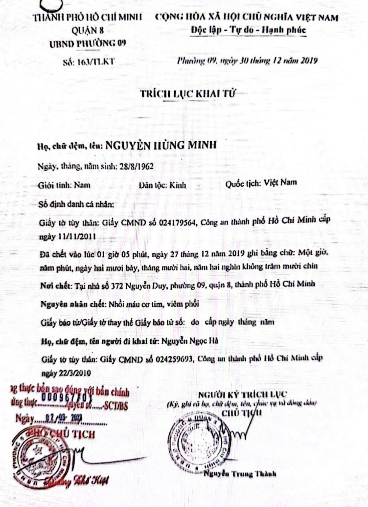 Dù hồ sơ không có Giấy báo tử hay giấy tờ khác thay Giấy báo tử, nhưng UBND phường 9 vẫn cấp Trích lục khai tử 163/TLKT ngày 30/12/2019, nội dung ông Minh chết “vào lúc 1h05’ ngày 27/12/2019”, “Nơi chết: tại nhà số 372 Nguyễn Duy, phường 9”.