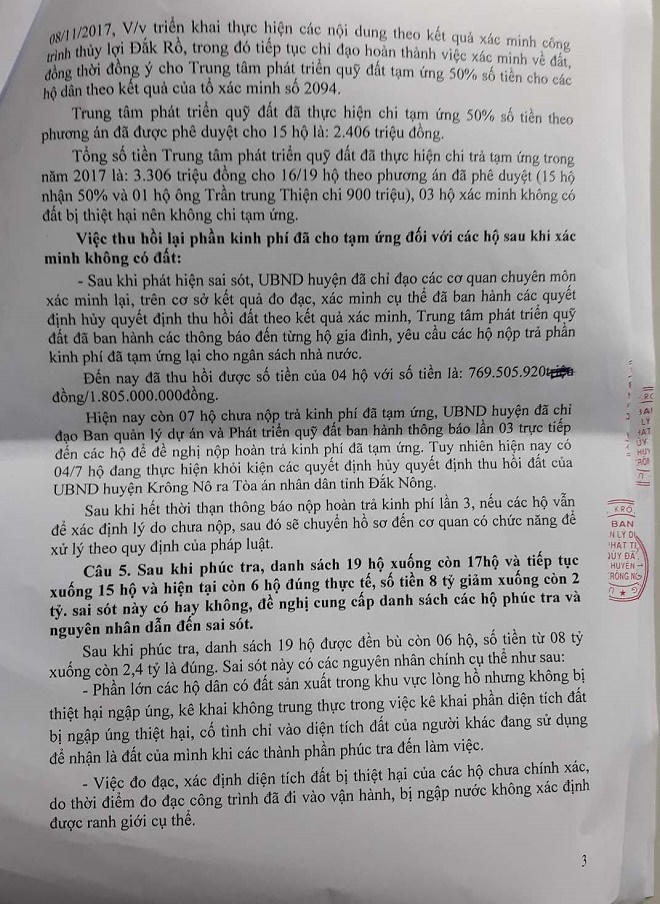 Vào tháng 6/2017, UBND huyện Krông Nô ban hành Quyết định phê duyệt phương án bồi thường, hỗ trợ với 19 hộ dân có đất bị ngập (bổ sung) tại dự án thủy lợi Đắk Rồ. Cũng trong thời gian này, UBND huyện có tờ trình, đề nghị UBND tỉnh Đắk Nông và Sở KH&ĐT tỉnh này bố trí hơn 8 tỷ (trước ngày 7/7/2017) để huyện “tổ chức chi trả 19 hộ dân trong diện đền bù”.