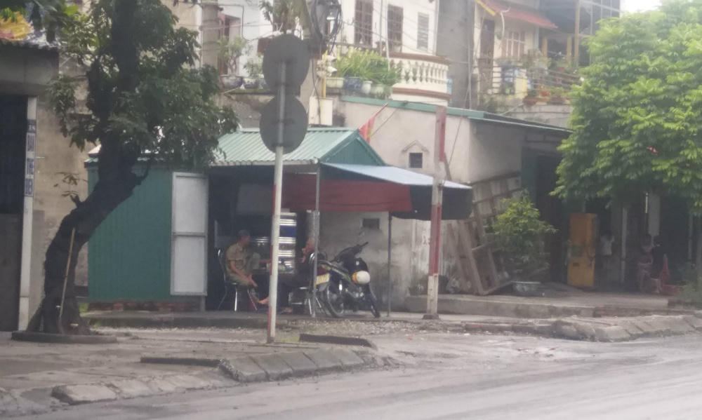 | Lực lượng bảo vệ dân phố, dân quân chốt tại trạm barie ngã ba Cống Trắng phường Mạo Khê (Đông Triều) |