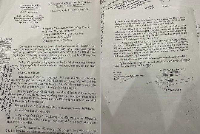 Mặc dù vậy, đến ngày 21/6/2021, UBND huyện An Dương mới có Văn bản số 926 (do Phó Chủ tịch Lê Văn Cường ký) “yêu cầu UBND xã Bắc Sơn khẩn trương tổ chức lực lượng, ngăn chặn ngay các hành vi xây dựng công trình trái phép vi phạm pháp luật về đất đai… không để vi phạm mới phát sinh, yêu cầu hộ ông Lê Quốc Khiêm giữ nguyên hiện trạng công trình để giải quyết, xử lý theo quy định của pháp luật; chủ động phối hợp với các phòng, ban, đơn vị liên quan kiểm tra, xác minh nguồn gốc đất, các hoạt động xây dựng công trình, ranh giới, phạm vi bảo vệ công trình thủy lợi đối với hộ ông Lê Quốc Khiêm để xác định rõ hành vi vi phạm theo quy định của pháp luật. Yêu cầu UBND xã Bắc Sơn báo cáo kết quả xử lý về UBND huyện trước ngày 26/6/2021…”.