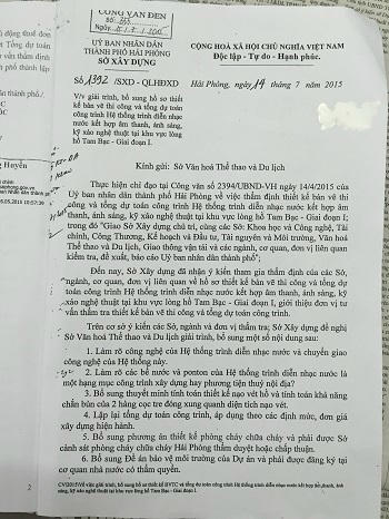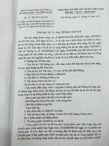 Theo văn bản của Sở KH&CN TP.Hải Phòng, tính đến thời điểm hiện nay, Sở KH&CN chưa nhận được kết quả giám định thiết bị nhập khẩu và xác nhận tính đồng bộ của hệ thống nhạc nước, các bên liên quan chưa có phương án hoặc hợp đồng chuyển giao công nghệ theo quy định pháp luật. Với các thiết bị tự chế tạo, đề nghị làm rõ quy cách, kích thước, các tính năng kỹ thuật, phương án thi công lắp đặt đảm bảo sự đồng bộ của các thiết bị này với thiết bị nhập khẩu… Công trình nhạc nước có nguy cơ bị chết yểu vẫn được “bật đèn xanh” để tiếp tục đội giá với con số lên tới hơn 218 tỷ đồng.
