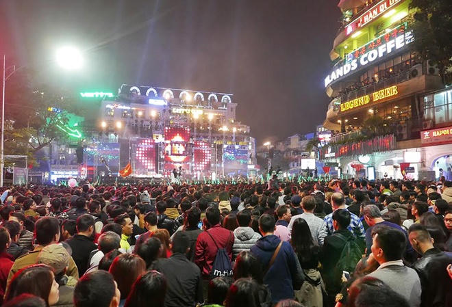 | Năm nay Hà Nội có hai địa điểm tổ chức đếm ngược lúc 0h là khu vực Nhà hát Lớn và tượng đài Lý Thái tổ khiến cho lượng người tập trung về đây đông hơn các năm trước. Ảnh: Zing |