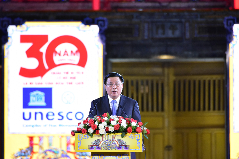 Trong thông điệp chúc mừng gửi đến lễ kỷ niệm, ông Lazare Eloundou Assomo - Tổng giám đốc Trung tâm Di sản Thế giới của UNESCO nhấn mạnh, kể từ khi Huế được công nhận là di sản thế giới cách đây 30 năm, thế giới đã vô cùng ấn tượng với hành trình của Huế, nơi minh chứng không chỉ thành tựu quan trọng trong việc bảo tồn và phát triển di sản thế giới, mà còn là biểu tượng cho sự tái sinh của Việt Nam bước ra từ gian khổ và những tàn phá sau hàng thập kỷ chiến tranh. Cố đô Huế đã chuyển mình từ một kho báu di sản bị tàn phá trở thành một biểu tượng nổi bật của bảo tồn di sản và hợp tác quốc tế.