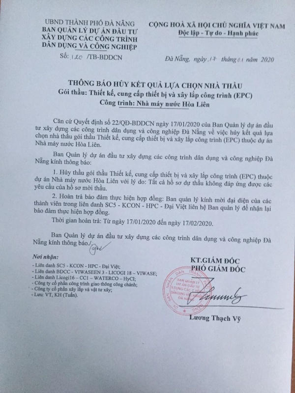 Ngày 3/2, Ban quản lý Dự án đầu tư xây dựng công trình dân dụng và công nghiệp Đà Nẵng (BQL) cho biết, kết quả đấu thầu dự án xây dựng Nhà máy nước Hòa Liên đã bị hủy và phải đấu thầu lại. Đây là công trình trọng điểm kỳ vọng giúp Đà Nẵng đảm bảo nguồn cung cấp nước sạch sinh hoạt cho TP tránh lặp lại tình trạng thiếu nước nghiêm trọng như thời gian qua.
