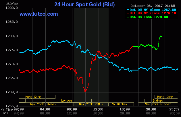 Trên thị trường thế giới, giá vàng giao theo hợp đồng bán buôn trong phiên giao dịch đêm 8/10 (giờ Việt Nam) tăng 14 USD so với chốt phiên giao dịch ngày hôm trước, niêm yết ở mốc 1.277,2 USD/oz.