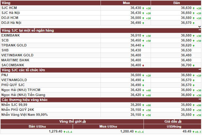 Tại Công ty SJC, giá vàng niêm yết chiều mua vào là 36,43 triệu đồng/lượng, ở chiều bán ra có mức giá là 36,65 triệu đồng/lượng. Tại thị trường TP.HCM, chiều bán ra niêm yết ở mức giá 36,63 triệu đồng/lượng.