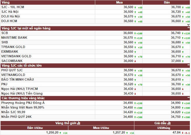 Trong khi đó, giá vàng miếng SJC tại công ty TNHH Vàng bạc đá quý Bảo Tín Minh Châu cũng tăng 80 nghìn đồng/lượng ở chiều mua vào và tăng 110 nghìn đồng/lượng chiều bán ra, lên 36,62-36,7 triệu đồng/lượng.