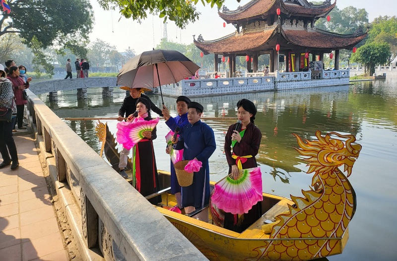 | Khách đến Đền Đô còn được thưởng thức các làn quan họ đặc sắc. |