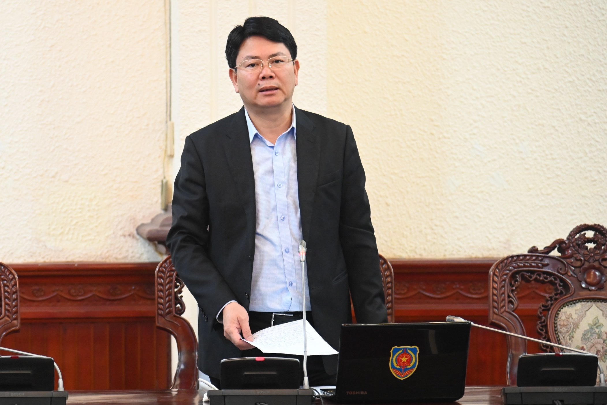 Phó Chánh Văn phòng Bộ Tư pháp Lê Tuấn Phòng báo cáo tại cuộc họp. |