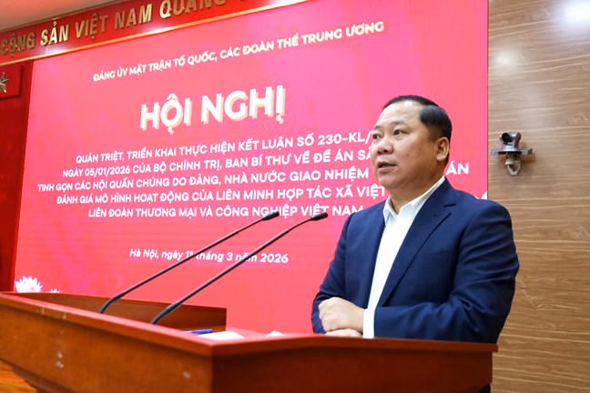 Ngày 11/3, tại Hà Nội, Đảng ủy Mặt trận Tổ quốc (MTTQ), các đoàn thể Trung ương tổ chức Hội nghị quán triệt, triển khai thực hiện Kết luận số 230-KL/TW ngày 05/01/2026 của Bộ Chính trị, Ban Bí thư về Đề án sắp xếp, tinh gọn các Hội quần chúng do Đảng, Nhà nước giao nhiệm vụ và Đề án đánh giá mô hình hoạt động của Liên minh Hợp tác xã (HTX) Việt Nam, Liên đoàn Thương mại và Công nghiệp Việt Nam.