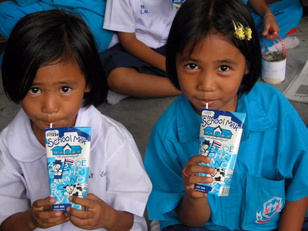Hình ảnh học sinh tại Thái Lan uống sữa cùng bạn bè (nguồn: internet)