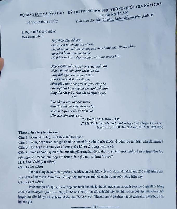 Đề thi có 2 phần. Trong đó, phần Đọc hiểu (3 điểm) có các câu hỏi từ đoạn trích "Đánh thức tiềm lực" của tác giả Nguyễn Duy.