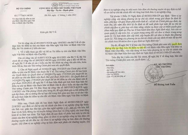 Cụ thể, tại Văn bản số 7203/BTC-HCSN ngày 1/7/2021 trả lời Công văn 4912/BYT-TCCB ngày 18/6/2021 của Bộ Y tế về việc thực hiện thí điểm tự chủ của Bệnh viện (BV) Hữu nghị Việt Đức và BV Chợ Rẫy, Bộ Tài chính đề nghị Bộ Y tế thực hiện đánh giá tình hình thực hiện thí điểm tự chủ tại BV Bạch Mai và BV K như ý kiến chỉ đạo của Phó Thủ tướng Vũ Đức Đam tại Công văn số 3897/VPCP-KGVX ngày 11/6/2021; trong đó đánh giá cụ thể những kết quả đạt được, chỉ ra những tồn tại, hạn chế trong thời gian qua làm cơ sở cho việc đề xuất thực hiện thí điểm tự chủ với BV Hữu Nghị Việt Đức và BV Chợ Rẫy.