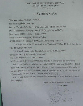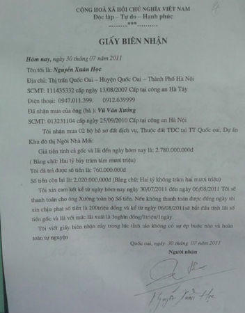 Tuy nhiên, khi đến hạn ông Học không chi trả theo đúng cam kết. Ông Xưởng cho biết, ngày 29/5/2011, ông Học trả 500 triệu đồng và viết cam kết trả hết 1,8 tỷ đồng từ ngày 30/5 - 8/6/2011. Song đến ngày 16/6/2011, ông Học lấy lý do chưa gom đủ tiền trả nên tự nguyện viết giấy cam kết sẽ trả thêm 300 triệu đồng gọi là bù đắp việc trả tiền chậm. Tại buổi gặp mặt, ông Học hứa trả tiền vào ngày 30/6/2011.