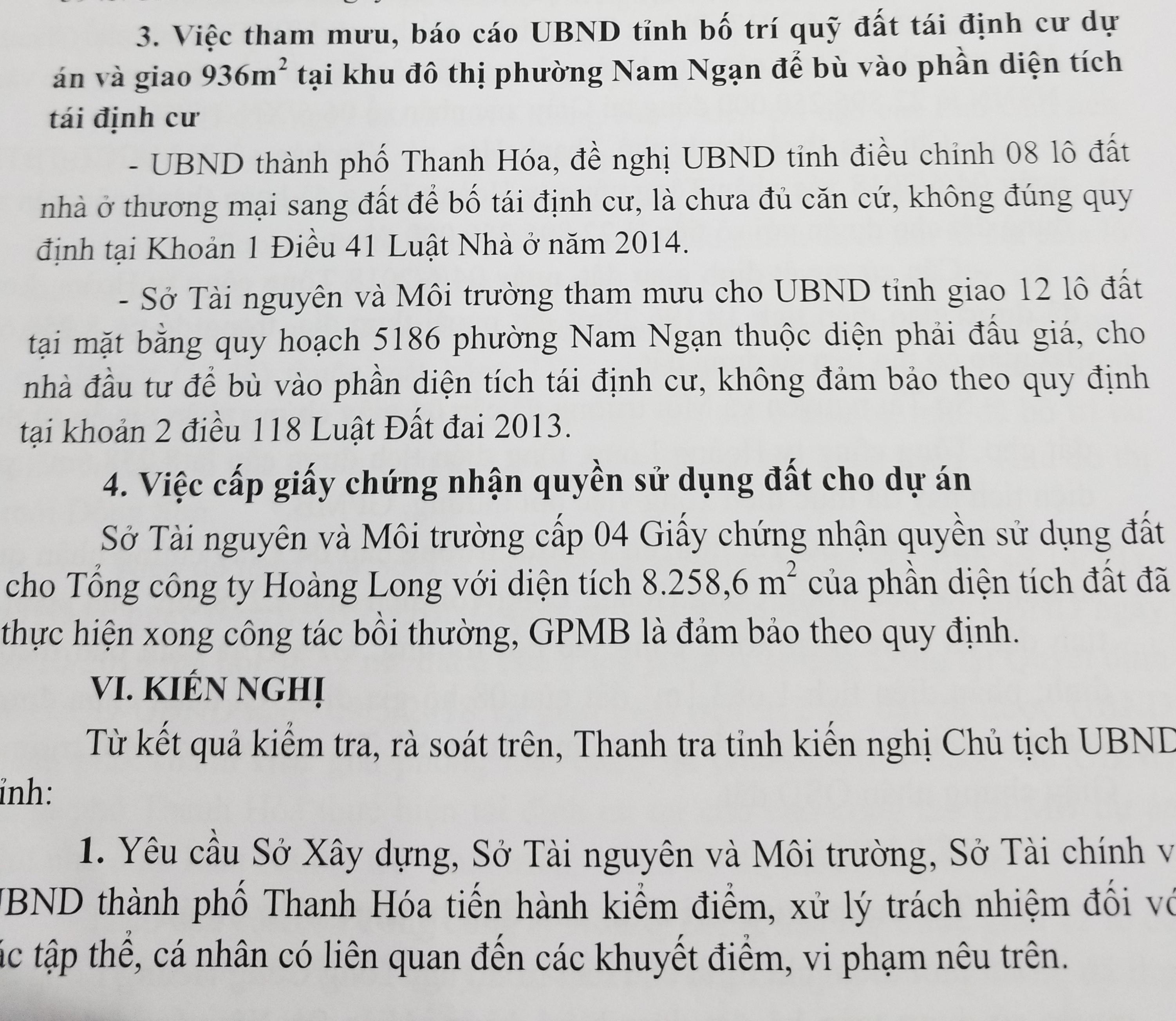 Nội dung Báo cáo của Thanh tra tỉnh Thanh Hóa chỉ rõ những sai phạm đối với một số sở ngành trong quá trình tham mưu cho Chủ tịch UBND tỉnh Thanh Hóa. Cụ thể như sau: Đối với Sở Xây dựng Thanh Hóa tham mưu cho Chủ tịch UBND tỉnh Thanh Hóa, chỉ định cho Tổng Công ty Hoàng Long làm chủ đầu tư thực hiện dự án khi doanh nghiệp này chưa có quyền sử dụng toàn bộ đất để thực hiện dự án là chưa đảm bảo các điều kiện theo quy định tại Điểm c, Khoản 1, Điều 13 Nghị định số 71/2010/NĐ-CP để chỉ định chủ đầu tư, là chưa đảm bảo theo quy định trên.