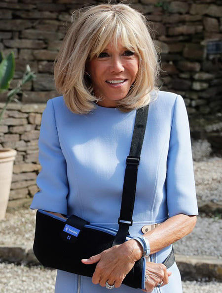 Bà Brigitte Macron đeo đai đỡ tay phải, cười tươi sánh vai chồng trong cuộc gặp Tổng thống Nga hôm 19/8.