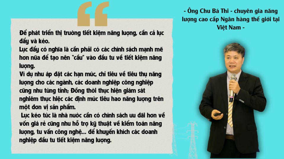 Để phát triển thị trường tiết kiệm năng lượng, chuyên gia Chu Bá Thi cho rằng cần cả lực đẩy và kéo. Lực đẩy có nghĩa là cần phải có các chính sách mạnh mẽ hơn nữa để tạo nên “cầu” vào đầu tư về tiết kiệm năng lượng. Ví dụ như áp đặt các hạn mức, chỉ tiêu về tiêu thụ năng lượng cho các ngành, các doanh nghiệp công nghiệp cũng như từng tỉnh; Đồng thời thực hiện giám sát nghiêm thực hiện các định mức tiêu hao năng lượng trên một đơn vị sản phẩm.