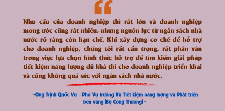 Trước thực tế này, Phó Vụ trưởng Trịnh Quốc Vũ chia sẻ: “Nhu cầu của doanh nghiệp thì rất lớn và doanh nghiệp mong ước cũng rất nhiều nhưng nguồn lực từ ngân sách nhà nước rõ ràng còn hạn chế. Khi xây dựng cơ chế để hỗ trợ cho doanh nghiệp, chúng tôi rất cẩn trọng, rất phân vân trong việc lựa chọn hình thức hỗ trợ để tìm kiếm giải pháp tiết kiệm năng lượng đủ khả thi cho doanh nghiệp triển khai và cũng không quá sức với ngân sách nhà nước”.