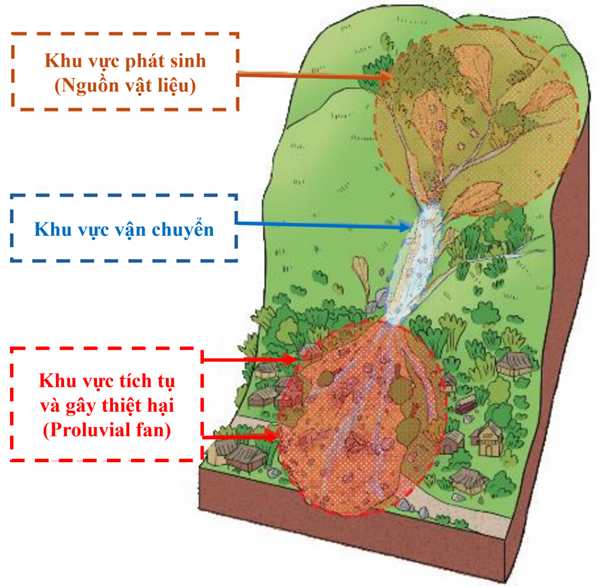 Mô hình khái quát của dòng lũ bùn đá gồm 3 bộ phận chính-khu vực phát sinh, khu vực cung cấp nguồn vật liệu bùn đá, khu vực vận chuyển và khu vực tích tụ và gây thiệt hại chính. |