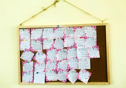 Những lời nhắn nhủ của ba mẹ được dán ở tấm bảng cuối lớp. Ảnh:Nhân vật cung cấp. |