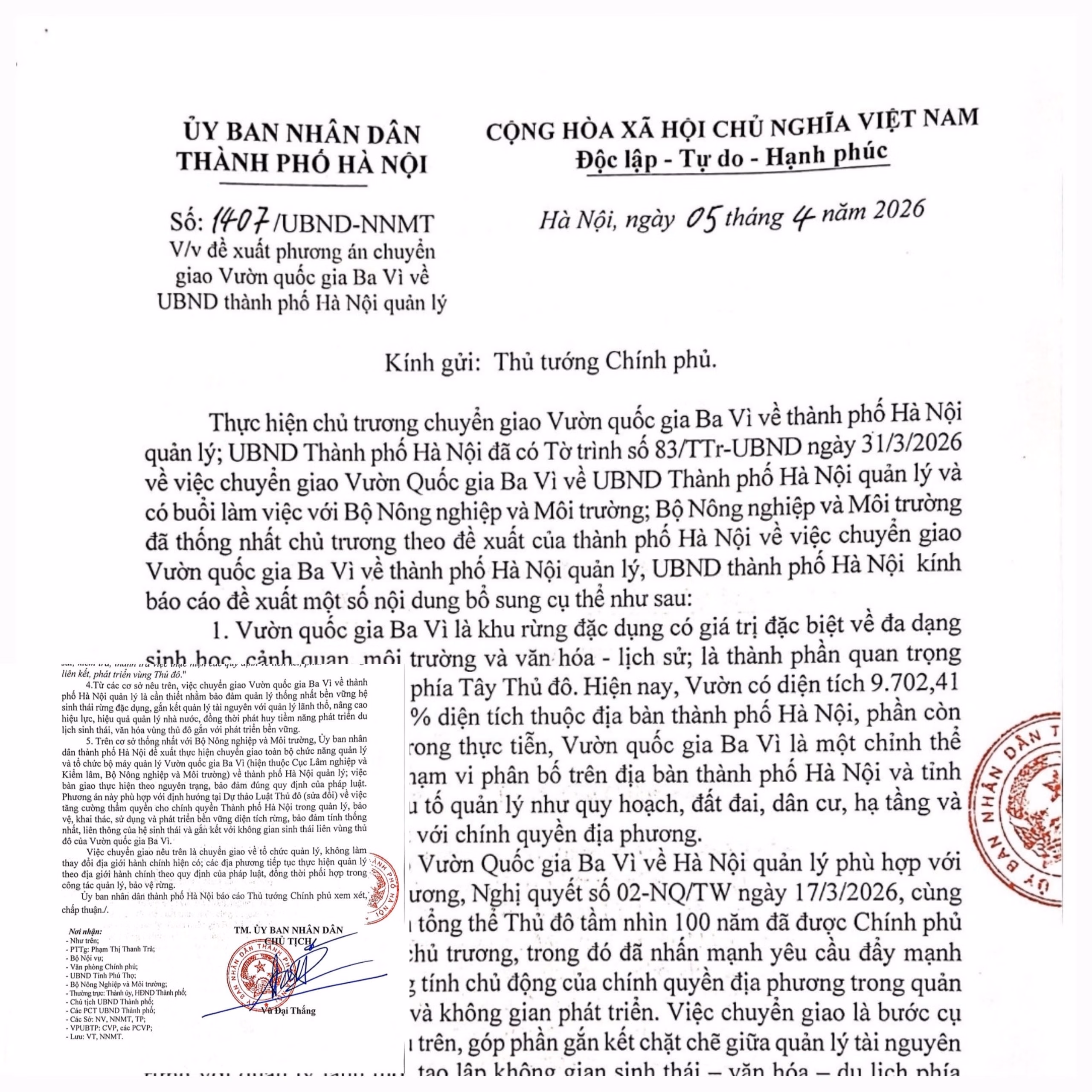 Thực hiện chủ trương của Chính phủ về nghiên cứu phương án chuyển giao Vườn quốc gia Ba Vì, UBND TP Hà Nội đã chủ động xây dựng hồ sơ, báo cáo và xin ý kiến các bộ, ngành, địa phương liên quan theo đúng quy định pháp luật.