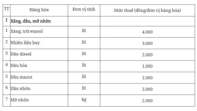 Dự thảo nêu rõ, mức thuế bảo vệ môi trường đối với xăng, dầu, mỡ nhờn từ ngày 1/1/2027 trở đi được thực hiện theo quy định tại Mục I khoản 1 Điều 1 của Nghị quyết số 579 ngày 26/9/2018 của Ủy ban Thường vụ Quốc hội về Biểu thuế bảo vệ môi trường.