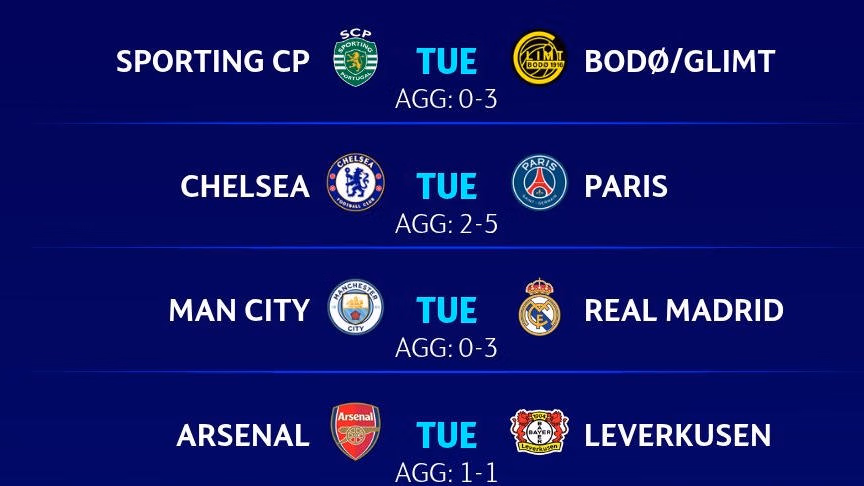 Vào 3h ngày 18/3 (giờ Việt Nam) 3 CLB nước Anh là Chelsea, Man City và Arsenal sẽ đá lượt về vòng 1/8 Champions League 2025/26 với các đối thủ rất mạnh là PSG (Chelsea thua 5-2 lượt đi), Real Madrid (Man City thua 3-0 lượt đi) và Leverkusen ( Arsenal hoà 1-1 lượt đi). Với thành tích đối đầu ở lượt đi như vậy, cơ hội đi tiếp của 3 CLB đến từ giải ngoại hạng Anh đặt cả vào Arsenal.