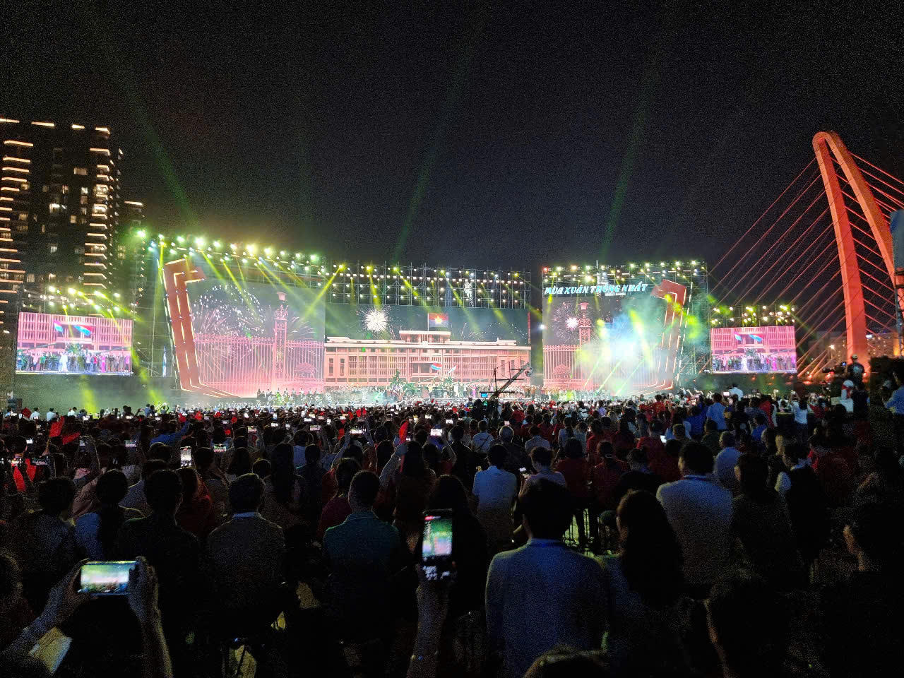 Hàng ngàn người đang hướng về sân khấu hoành tráng tại trung tâm đường Lê Duẩn, hào hứng xem Chương trình nghệ thuật đặc biệt. |