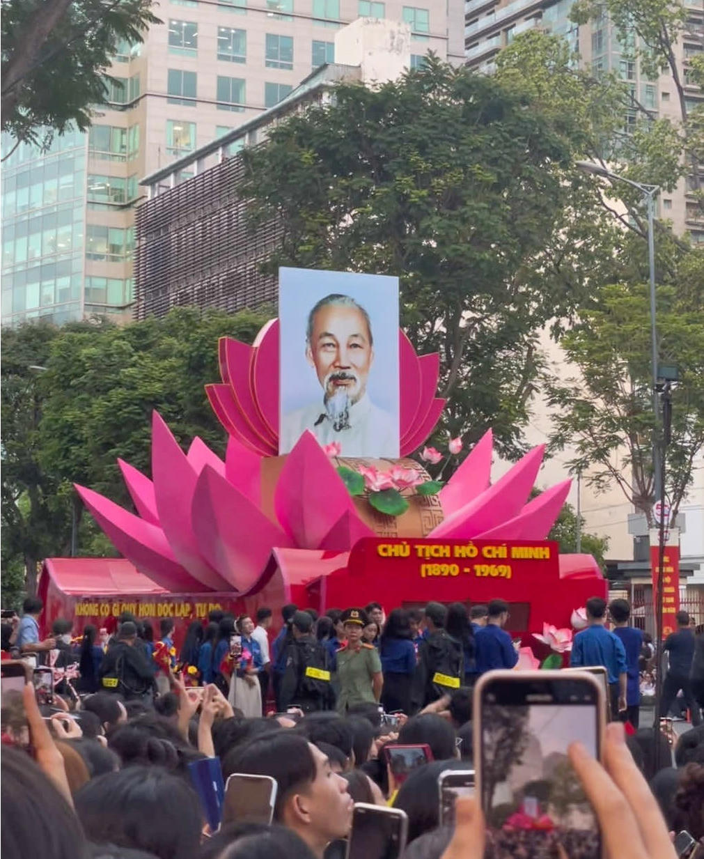 Tại khu vực trung tâm TP là mô hình diễu hành thiết kế công phu, nổi bật với chân dung Chủ tịch Hồ Chí Minh trên nền hoa sen hồng.