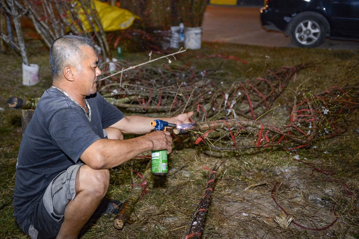Với những gốc đào lâu năm, người bán còn áp dụng kỹ thuật đốt gốc bằng đèn khò ngay trong đêm. Ngọn lửa nhỏ được đưa sát gốc cây để giữ nhựa, giúp hoa bền màu, lâu tàn, một kinh nghiệm chỉ những người gắn bó lâu năm với nghề mới nắm rõ.