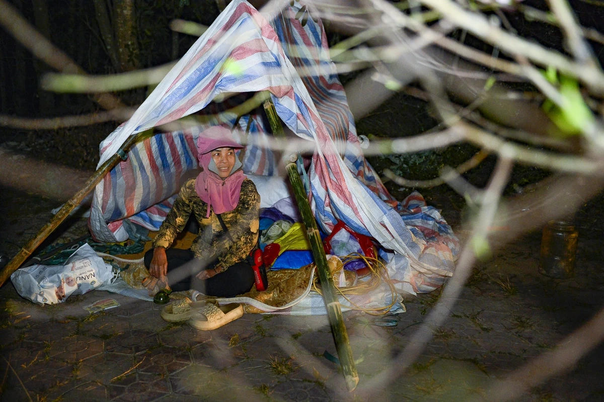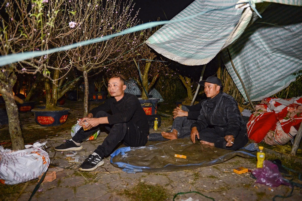 Từ chiều muộn, các bãi cây Tết đã nhộn nhịp người qua lại. Nhưng khi dòng xe thưa dần, phố phường chìm vào giấc ngủ, những ánh đèn trong các túp lều bạt ven đường vẫn sáng. Đó là nơi những người bán cây ngồi co ro tựa bên gốc đào, quất thay nhau canh hàng giữa gió lạnh luồn qua từng kẽ lá.