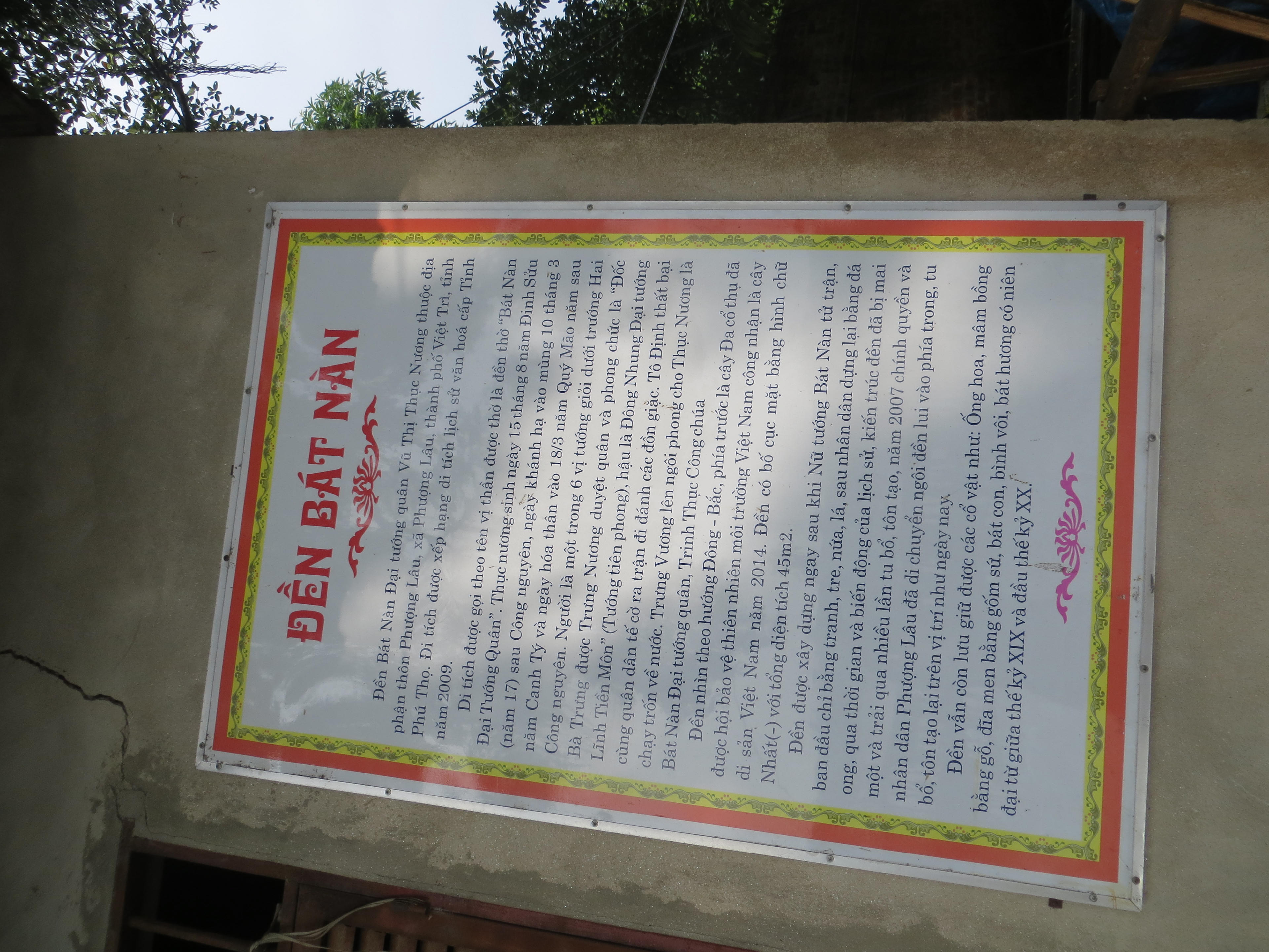 Dân gian truyền lại, sau khi nữ tướng Bát Nàn hi sinh vì nghĩa lớn, nhân dân xã Phượng Lâu, thành phố Việt Trì đã lập đền thờ phụng bà ngay khu vực cửa sông Lô. Ban đầu, dù ngôi đền chỉ là một am nhỏ bằng tre nứa đơn sơ, sau được xây lại bằng gạch đá ong vững chãi. Tương truyền khoảng 200 năm trước, khi sông Lô chưa đổi dòng, ngôi đền Bát Nàn được xây dựng ở vị trí phía ngoài cổng, chỗ gốc đa to hiện nay. Hiện cây đa cổ thụ này đã được chứng nhận Cây di sản.