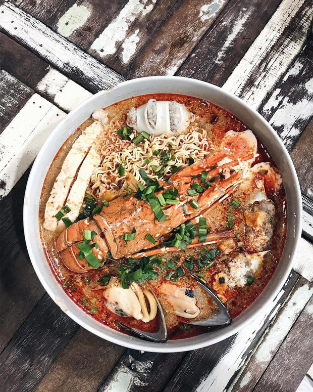 Nếu như bạn đang tìm kiếm một hương vị cực kì ấn tượng thì món mì tom yum tôm hùm tại P'Aor sẽ cực kì thích hợp với bạn. Khi món mì được phục vụ, bạn chắc hẳn sẽ phải há mồm ngạc nhiên bởi vì sẽ có một con tôm hùm to bự khổng lồ ngay ở chính giữa tô mì của bạn. Phần nước súp cực kì béo ngậy và đậm đà hương vị của hải sản như tôm, mực hay thậm chí cả hến chắc chắn sẽ khiến bạn gục ngã.