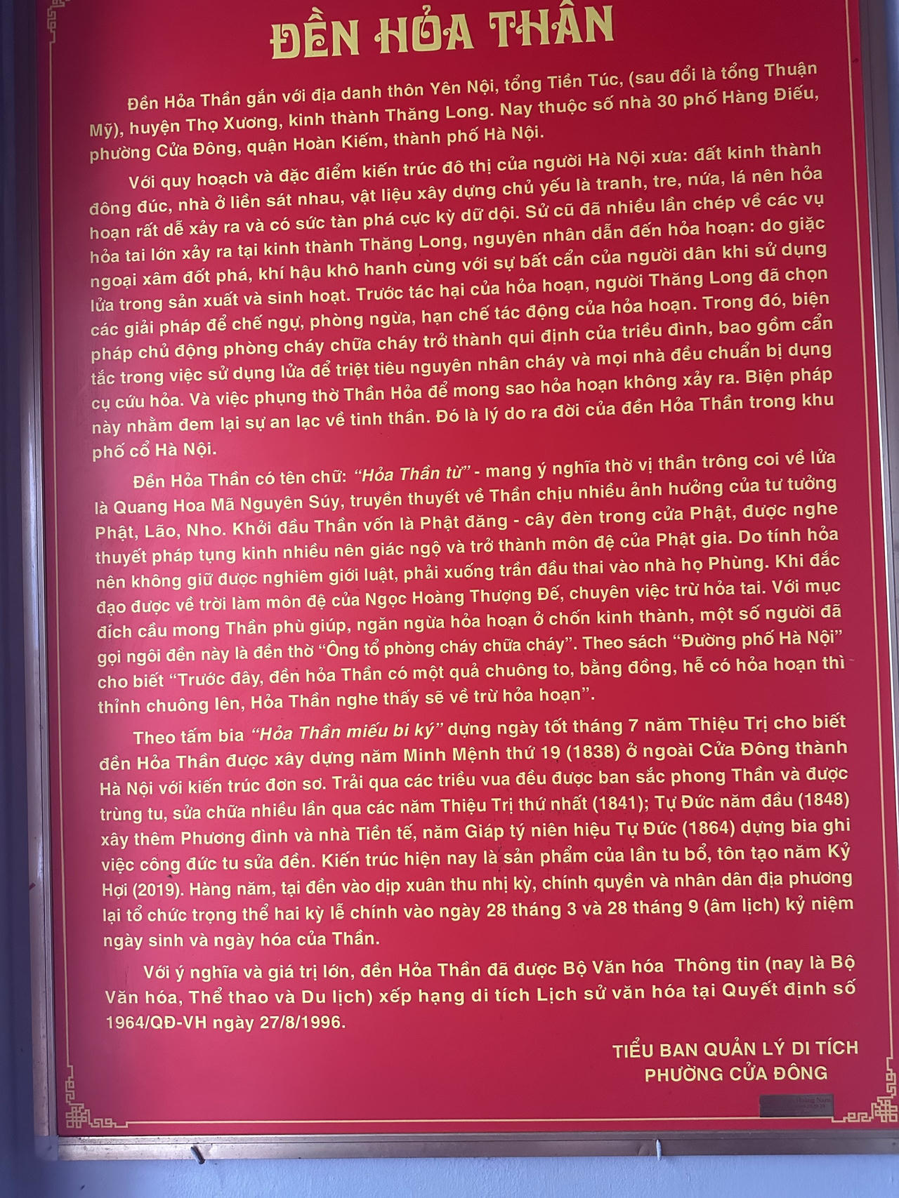 Đền Hỏa Thần là ngôi đền duy nhất thờ Thần Lửa tại Hà Nội và của nước ta. Được xây dựng đầu thế kỷ 19, ngôi đền được 34 lần sắc phong và được công nhận Di tích lịch sử văn hóa cấp quốc gia vào năm 1996. Theo “Hỏa thần miếu bia ký” dựng ngày tốt tháng 7 năm Thiệu Trị, đền Hỏa Thần được xây dựng năm Minh Mệnh thứ 19 (1838) ở ngoài Cửa Đông thành Hà Nội với kiến trúc đơn sơ. Trải qua các triều vua, đền đều được ban sắc phong thần và được trùng tu sửa chữa nhiều lần, đơn cử lần trùng tu ở các năm Thiệu Trị thứ nhất (1841), Tự Đức năm đầu (1848), xây thêm Phương đình, nhà tiền tế năm Giáp Tý niên hiệu Tự Đức (1864) dựng bia ghi việc công đức tu sửa đền.
