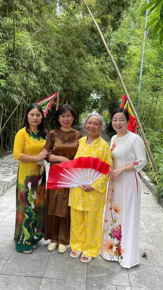 Nhóm du khách Hà Nội chụp ảnh lưu niệm với cụ Đinh Thị Phương Lâm (86 tuổi, cụ thủ từ Đền Trúc), cũng là một nghệ nhân hát Dậm có tiếng của vùng đất Hà Nam. |