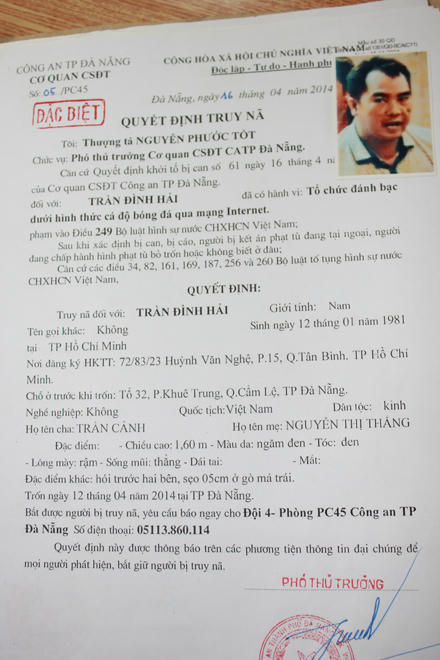 Sáng ngày 12/4, hàng chục “chân rết” trong đường dây cá độ này bị bắt quả tang khi đang tiến hành thực hiện giao dịch cá cược qua mạng. Tuy nhiên “tổng chính” Trần Đình Hải đã nhanh chân bỏ trốn và bị Cơ quan Cảnh sát điều tra Công an TP.Đà Nẵng phát lệnh truy nã đặc biệt trên toàn quốc.