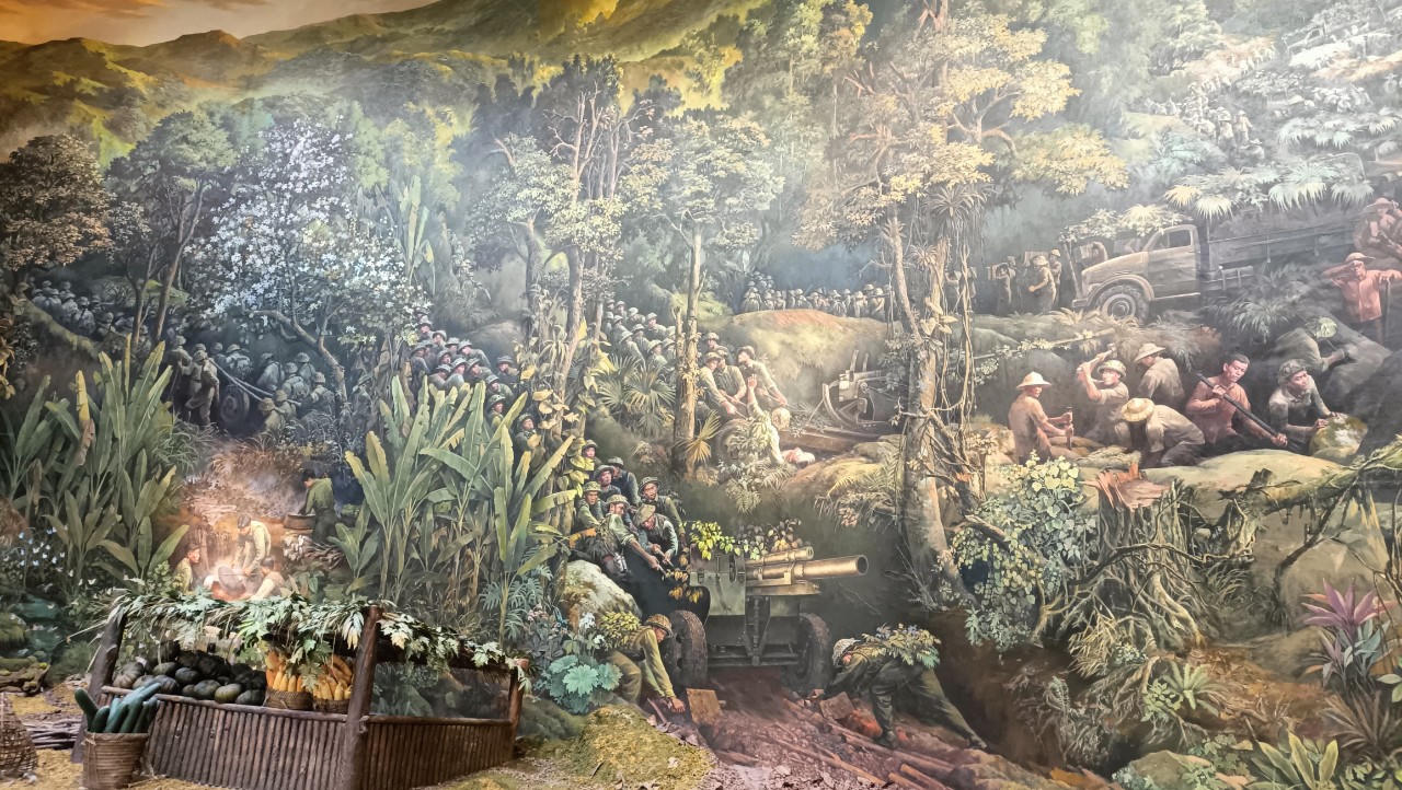 Tái hiện hình ảnh bộ đội kéo pháo vào mặt trận Điện Biên Phủ trong bức tranh panorama tại Bảo tàng Chiến thắng lịch sử Điện Biên Phủ. |