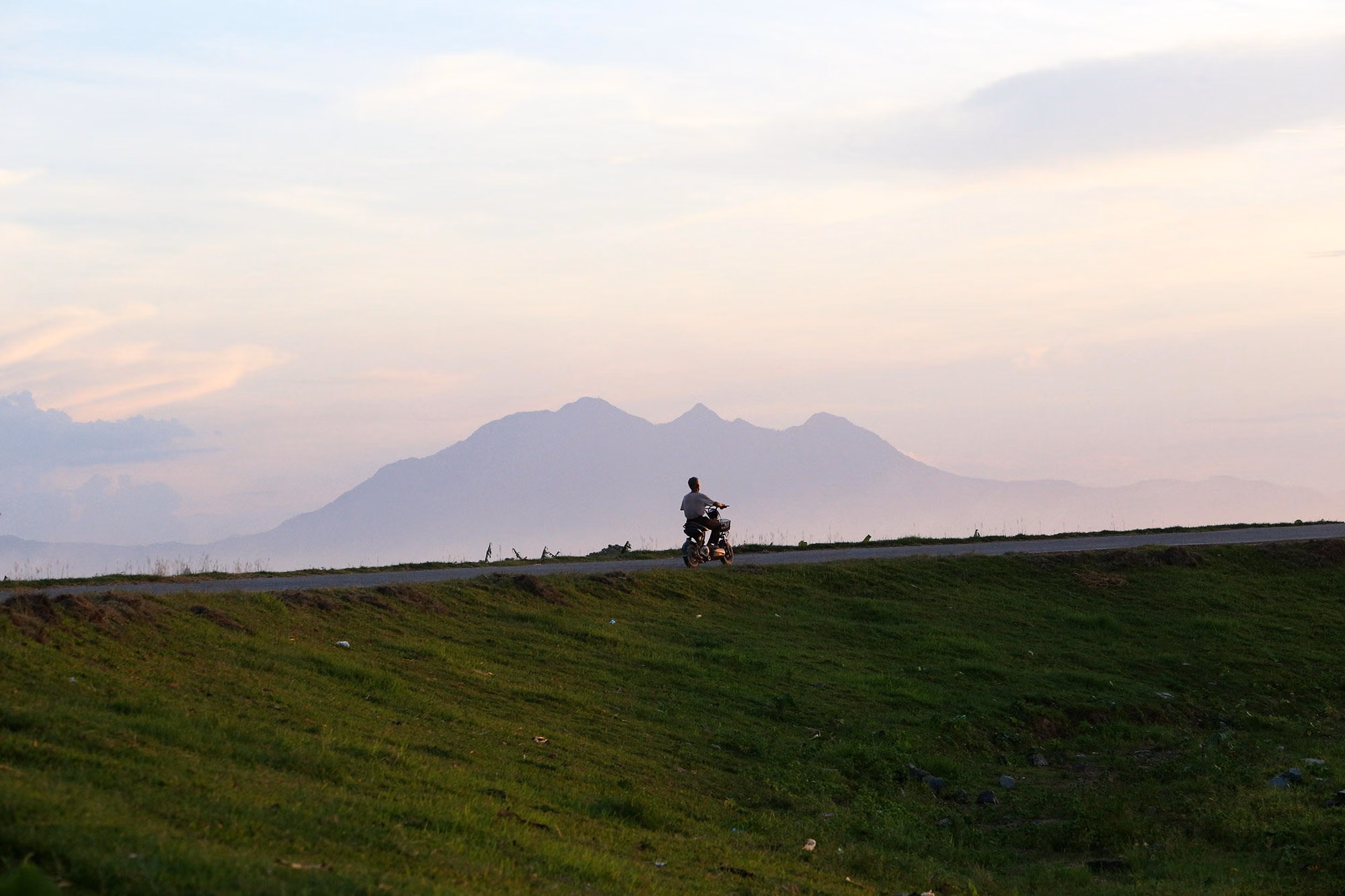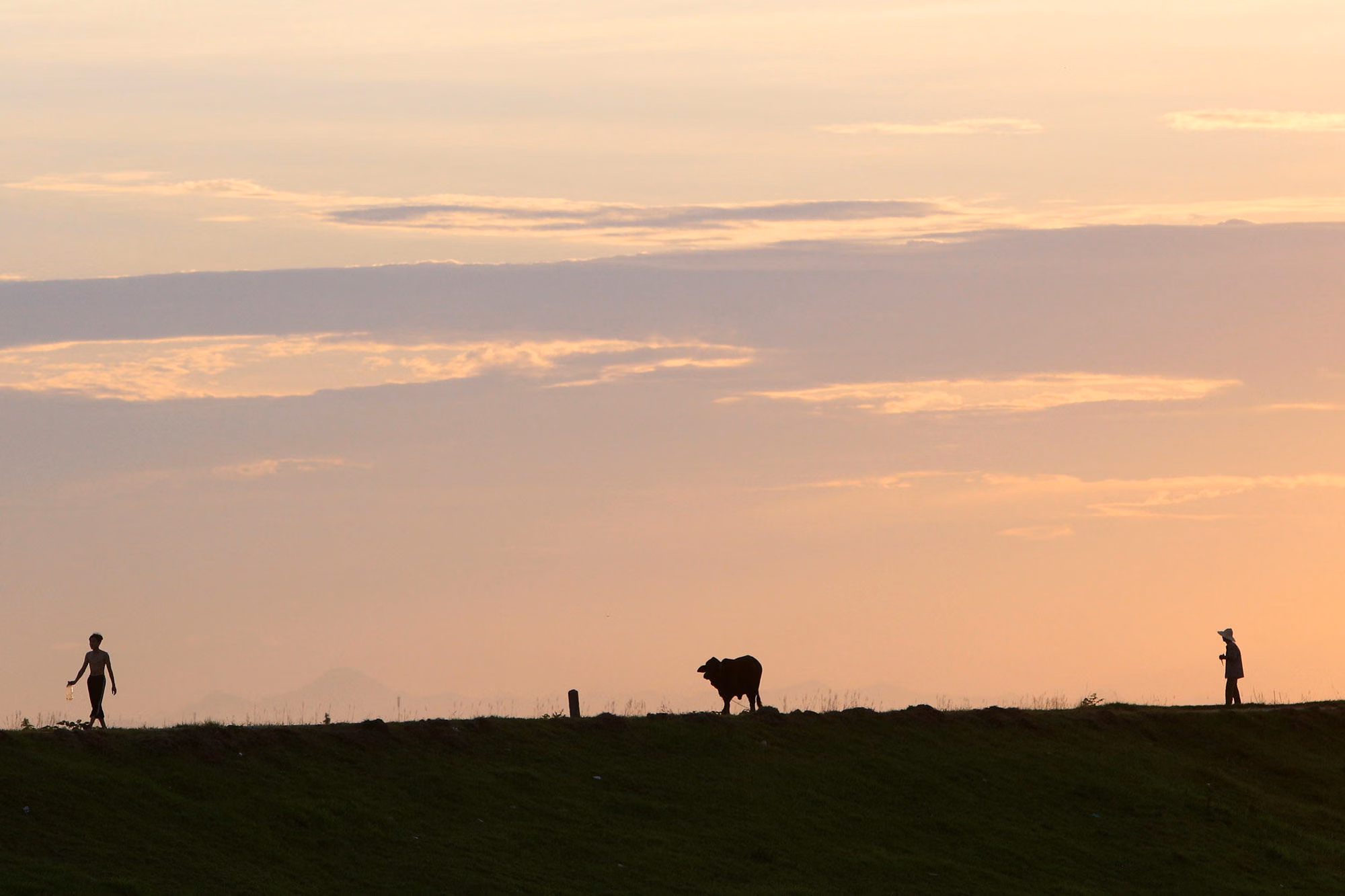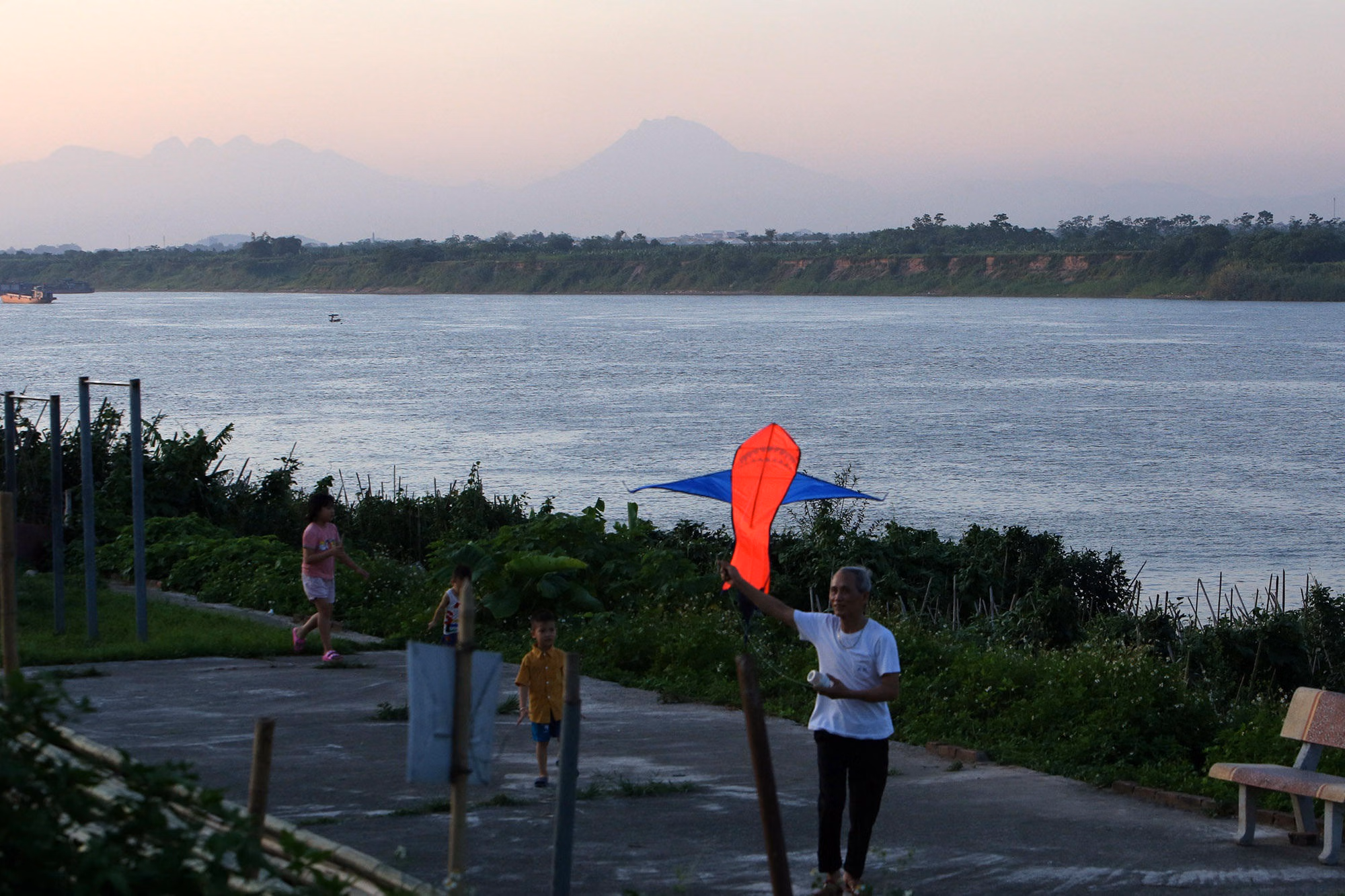 Hoàng hôn buông xuống triền đê Hữu Hồng đoạn qua xã Thọ An, huyện Đan Phượng, phía xa bên kia sông Hồng là dãy núi Tam Đảo.