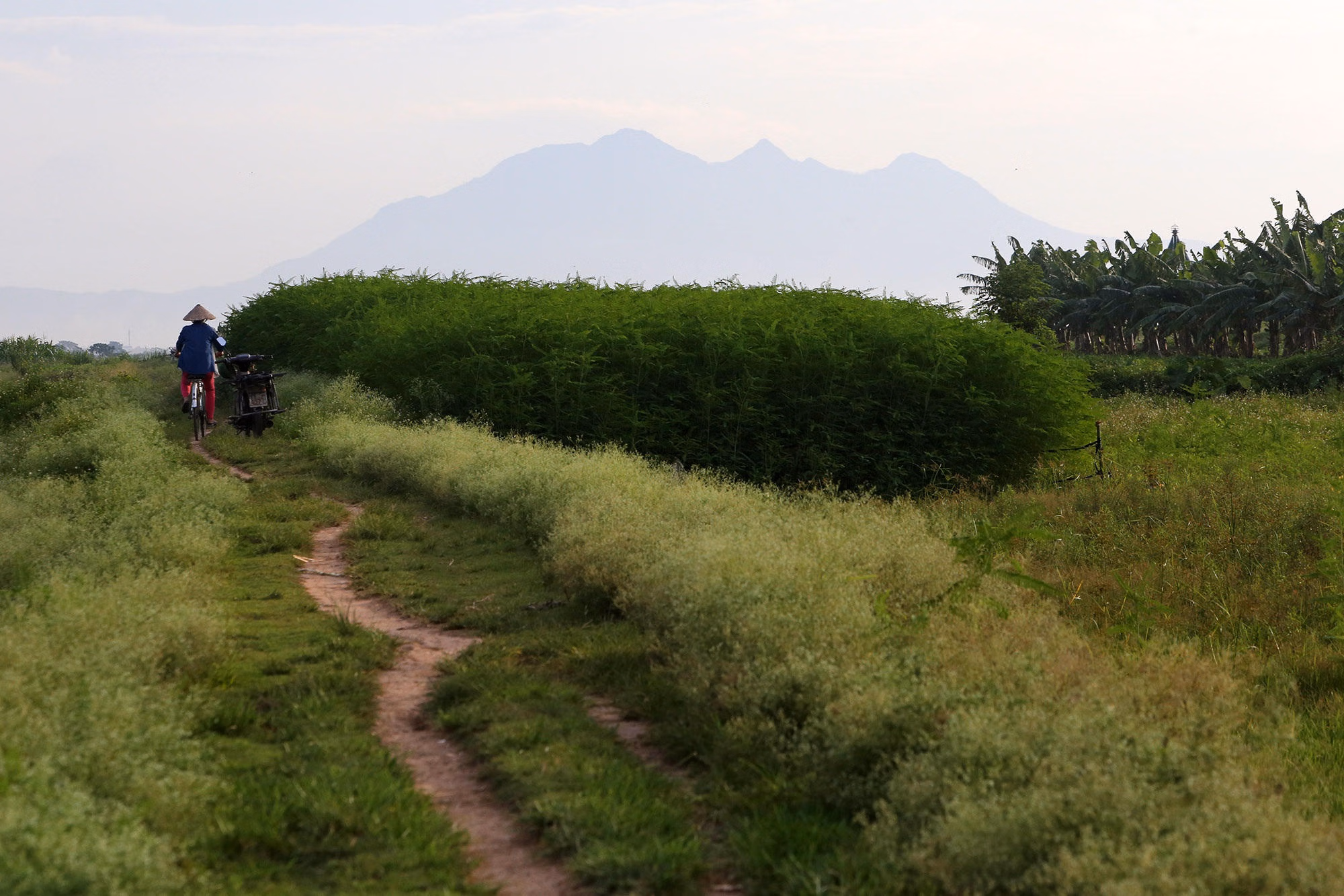 Phong cảnh làng quê yên bình với phía xa là dãy núi Tam Đảo nhìn từ triền đê Ngọc Tảo.