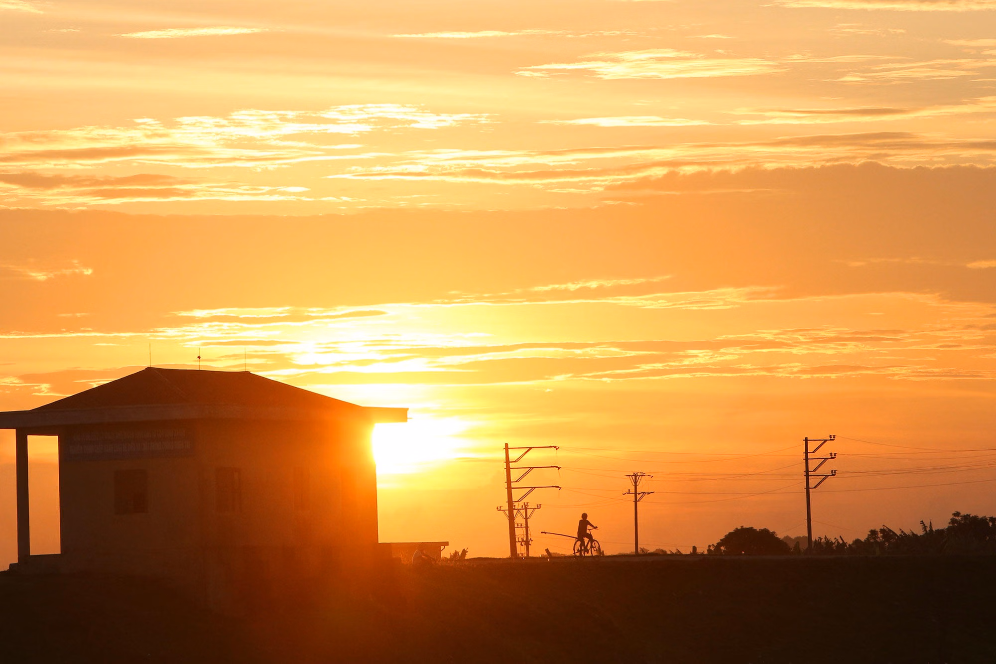 Ánh hoàng hôn đỏ rực buông xuống trên triền đê Tả Hồng.