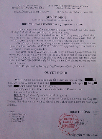 Ông Dung cho biết thêm: Về số lượng các sinh viên bị cấp bằng sai chính tả có đến 200 hoặc 300 gì đó. Nhà Trường đã cấp cho mỗi trường hợp một Quyết định của Hiệu trưởng trường ĐH Quang Trung về việc chỉnh sửa nội dung của bằng đại học.