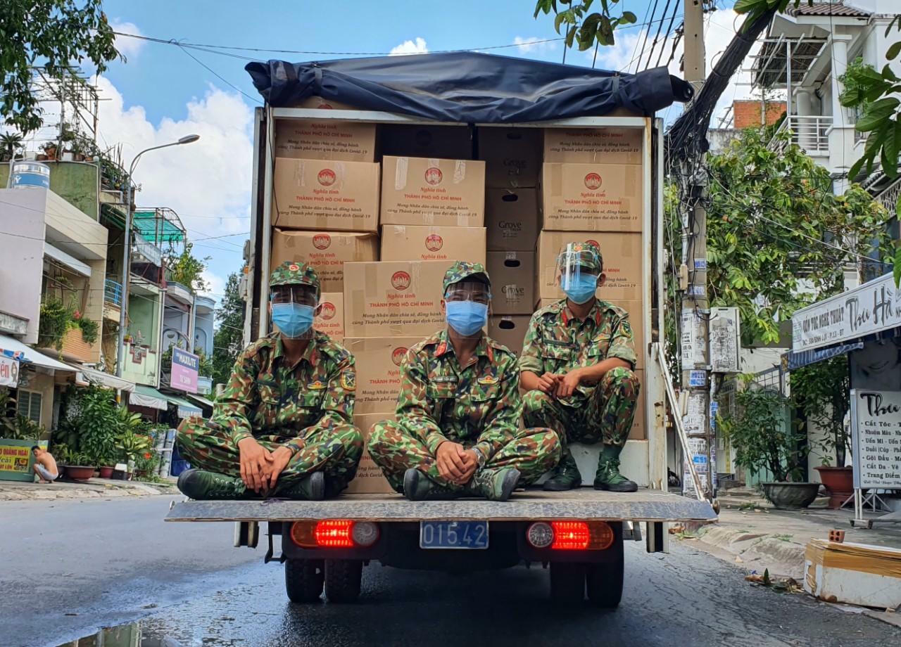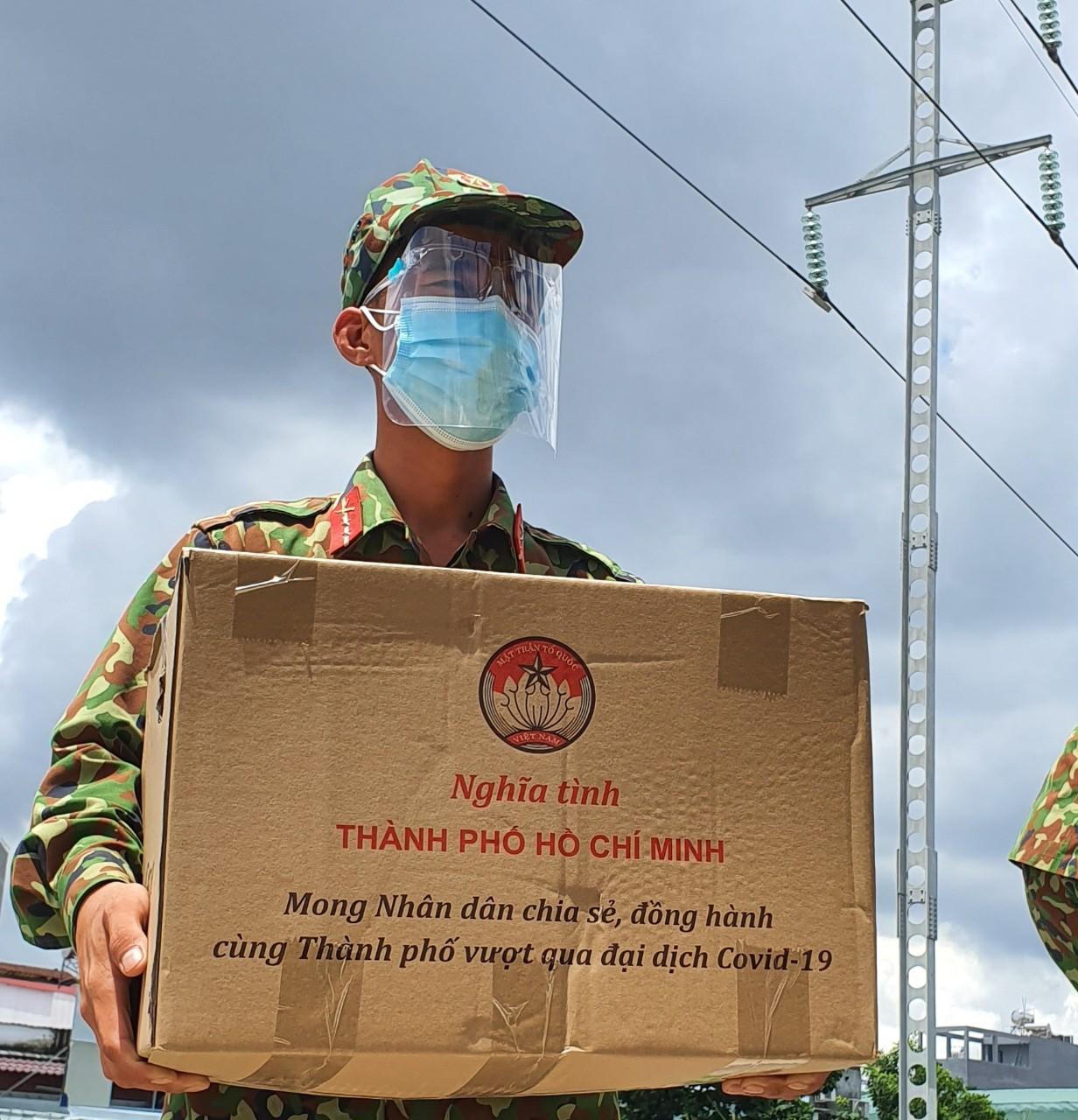 Rời phường 26, PV đến phường 13 quận Bình Thạnh; đi cùng nhóm cán bộ phường và bộ đội trên xe chở túi thực phẩm miễn phí. Đồ được cẩn thận đóng trong thùng giấy, có dòng chữ “Nghĩa tình TP HCM. Mong nhân dân chia sẻ, đồng hành cùng TP vượt qua đại dịch COVID-19”.