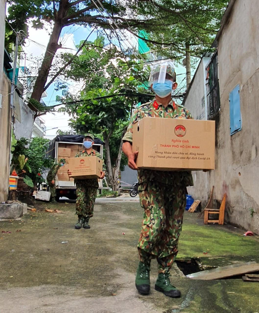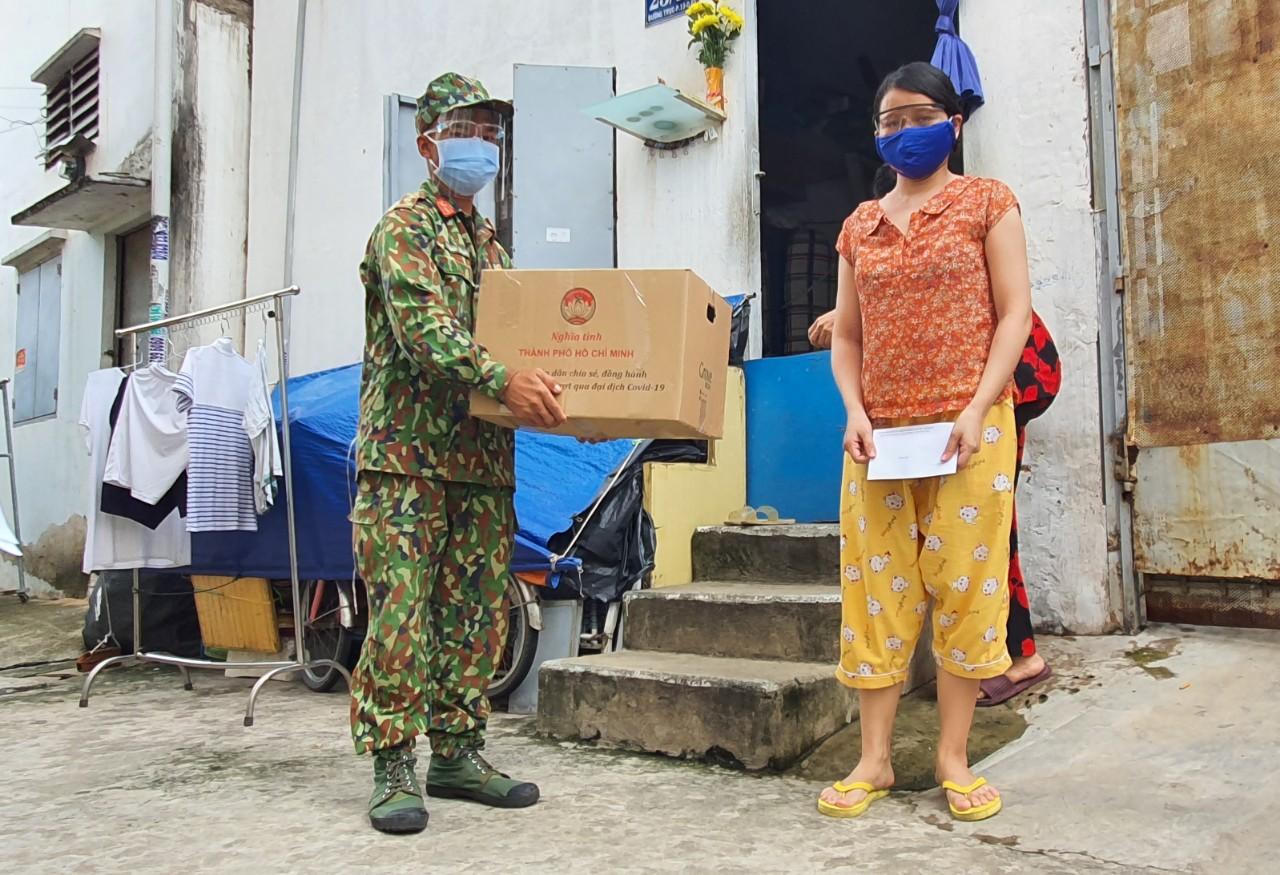 Các chiến sĩ bộ đội cùng cán bộ phường 13 Bình Thạnh trên đường đến các khu nhà trọ, hộ khó khăn trao túi thực phẩm và tiền mặt. |