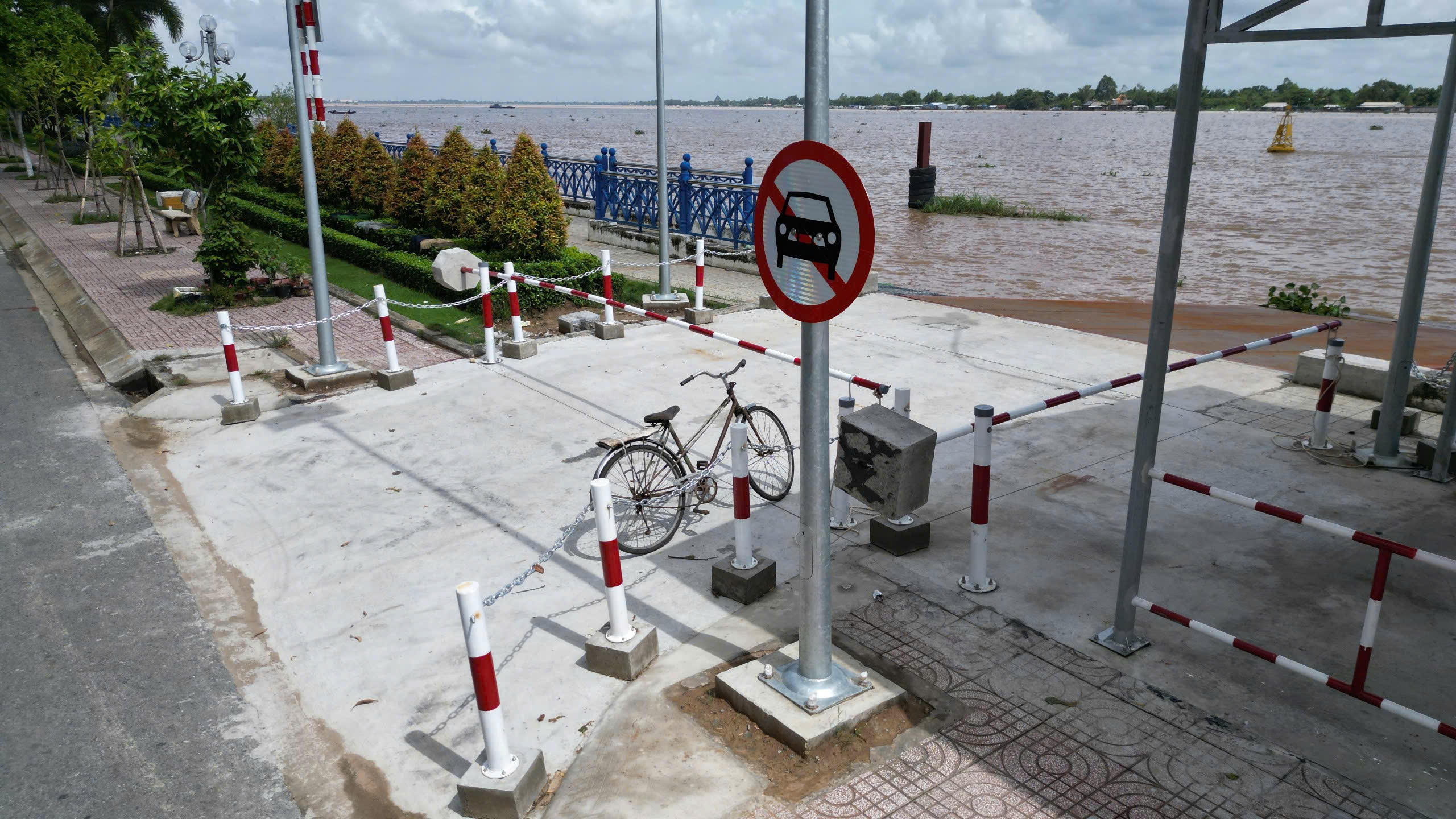 Biển báo cấm xe ô tô được đặt ở 2 đầu ra, vào của nhà chờ (ảnh Nguyễn Thuận). |
